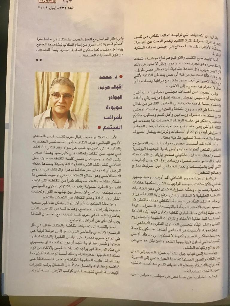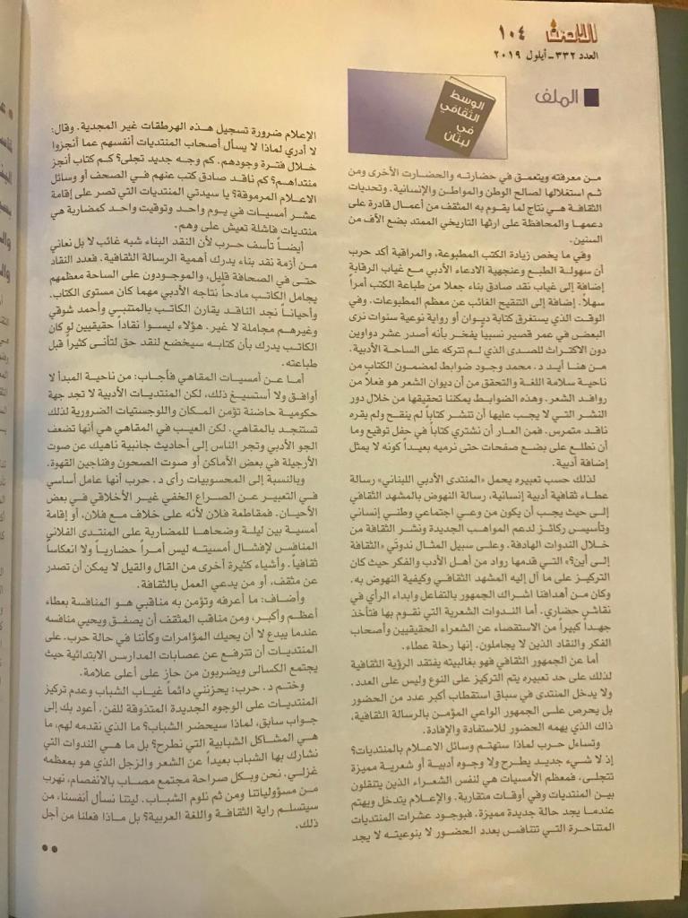 مقالي في ملف “الوسط الثقافي في لبنان” في مجلة الأمن عدد 332